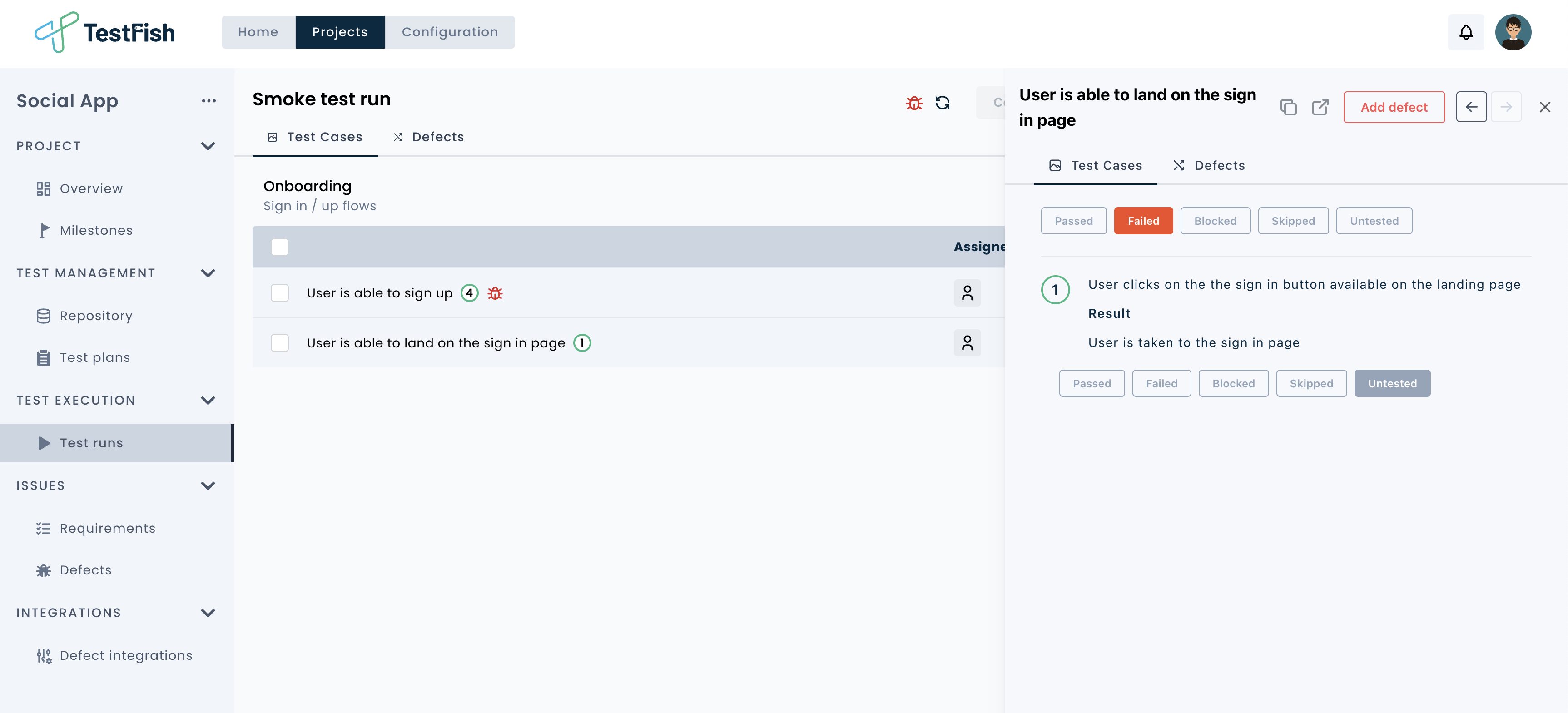 Capture all the defects that were observed while running the test runs or manage them independently with integrations for third party defect management tools